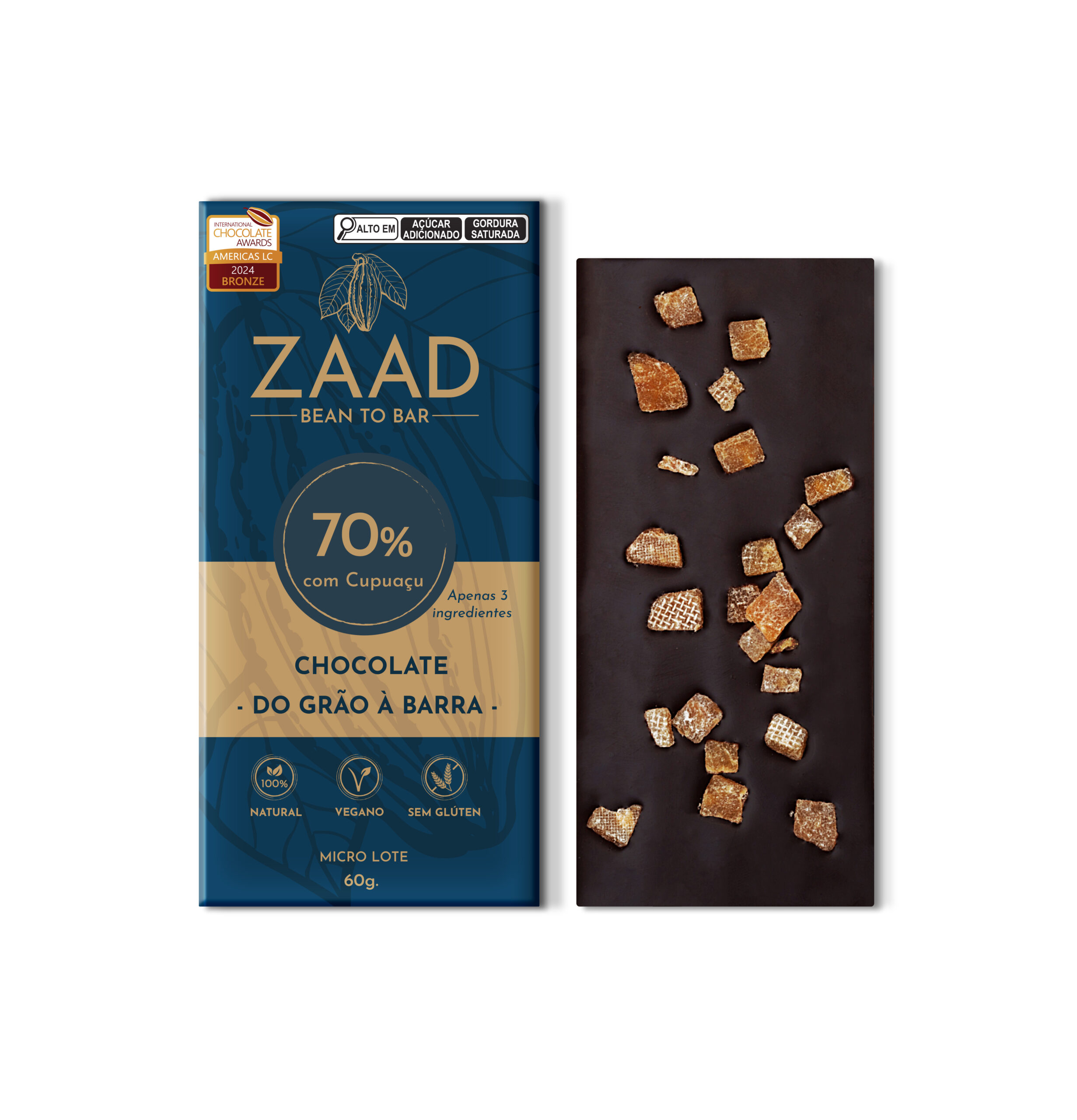 Ingredientes: Cacau, açúcar demerara orgânico e pedaços de cupuaçu.